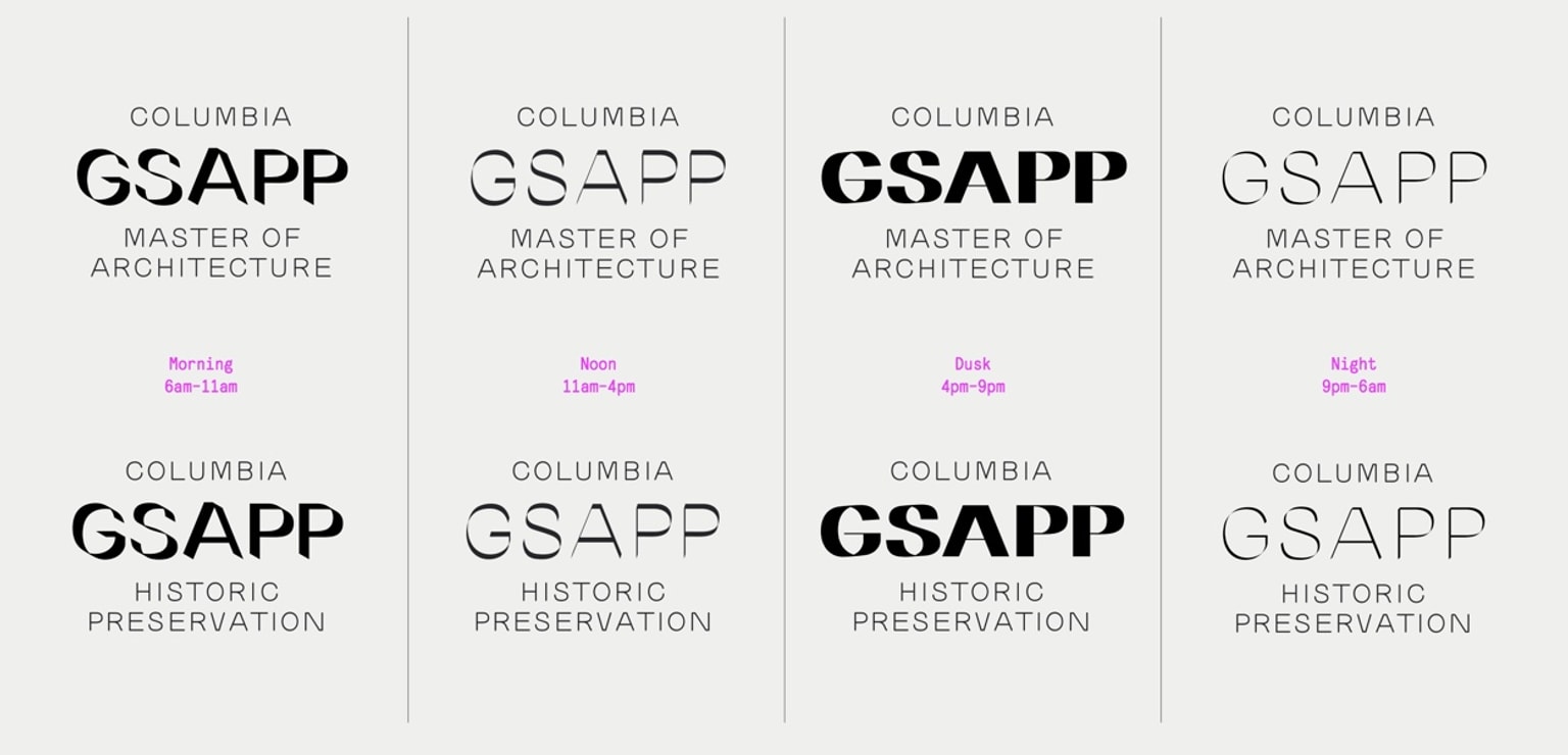 Columbia GSAPP’s wordmark takes the place of this missing sphere. Existing across four different typographic weights (Morning, Noon, Dusk, Night), the mark itself changes dynamically throughout the day, in four steps. It is a logo that doubles as a clock, mimicking the movement of the sun across its letters. The mark emphasizes the importance of context to architecture as well as education, and suggests the movement of students across the campus and across the duration of their academic and professional careers.
