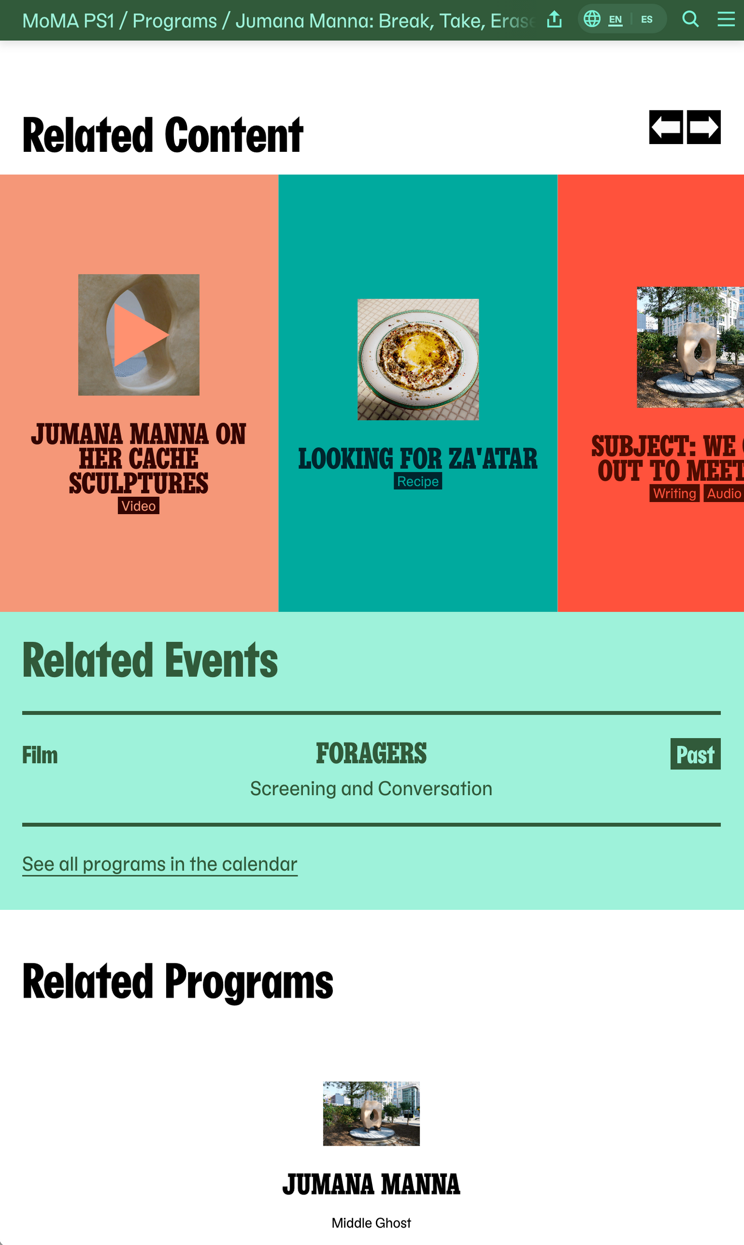 The homepage’s second tab is a sophisticated calendar which slides into view, providing a date-based rather than narrative means to explore PS1’s offerings. The site is highly optimized for performance, is extremely flexible for authors, and is optimized for mobile.