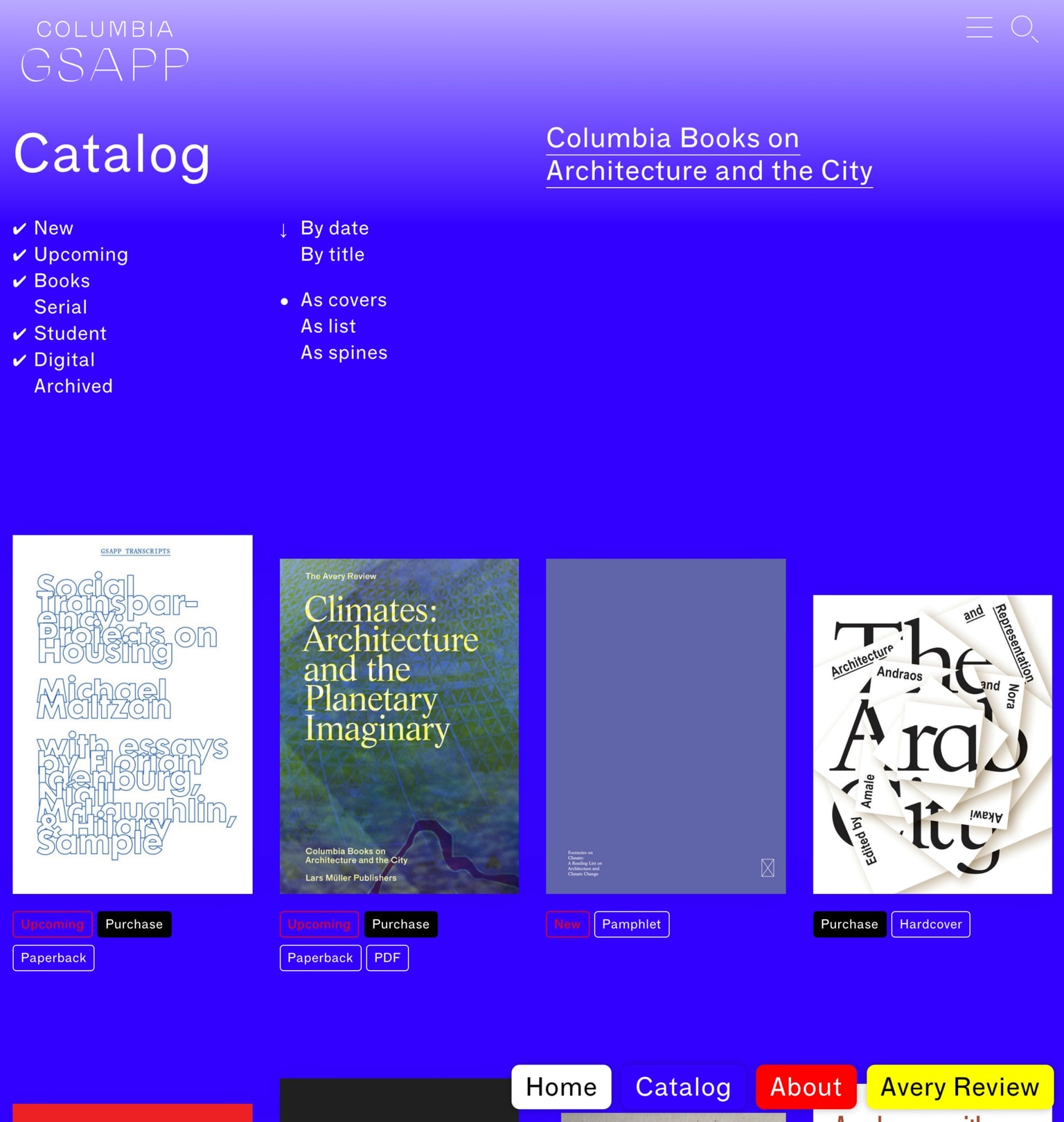 The catalog section of the site functions as a highly sortable archive of all books, viewable by covers, spines or text. As CBAC updates their printed catalog each year, the site’s color schema reflects the Pantone colors used in print.