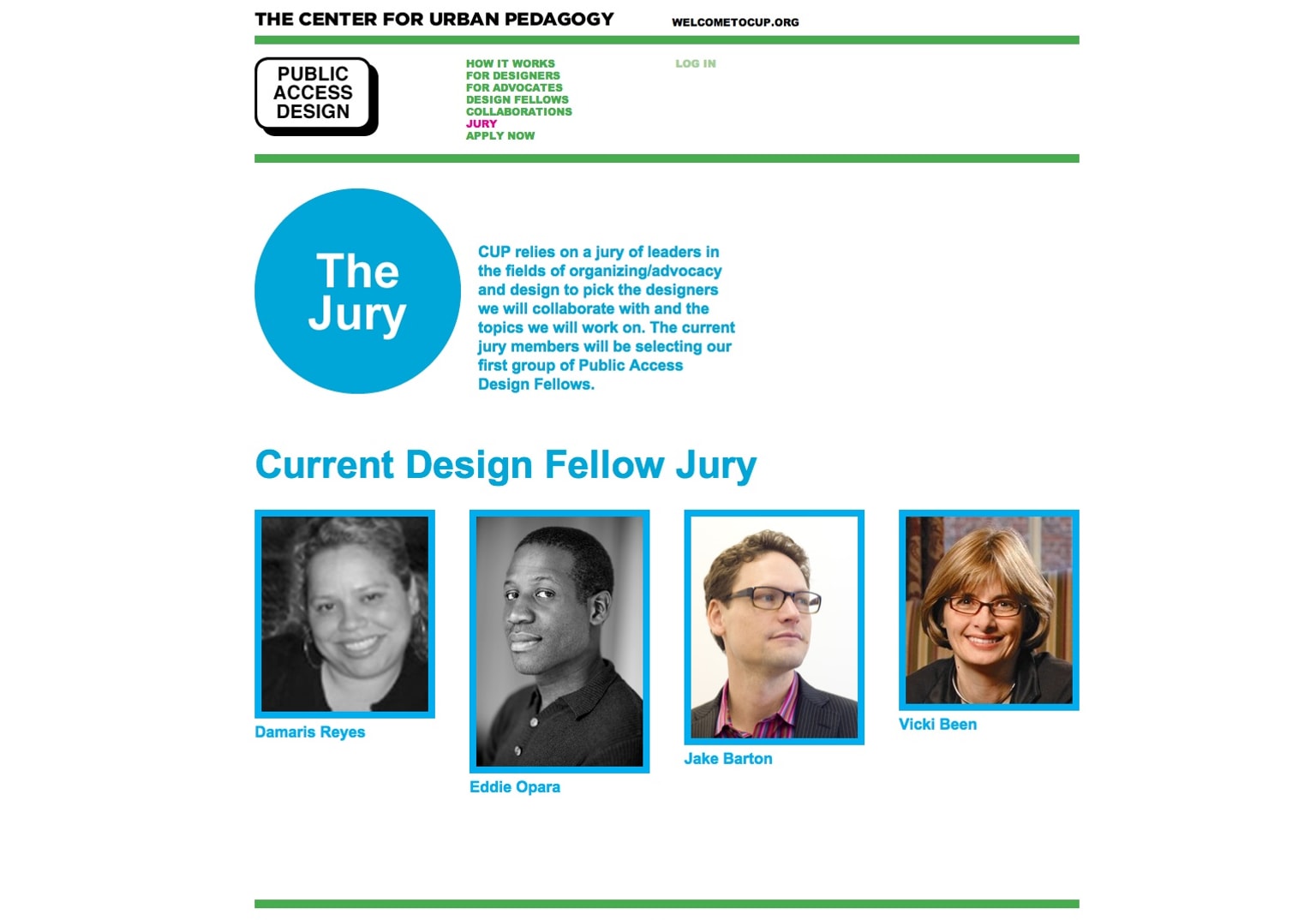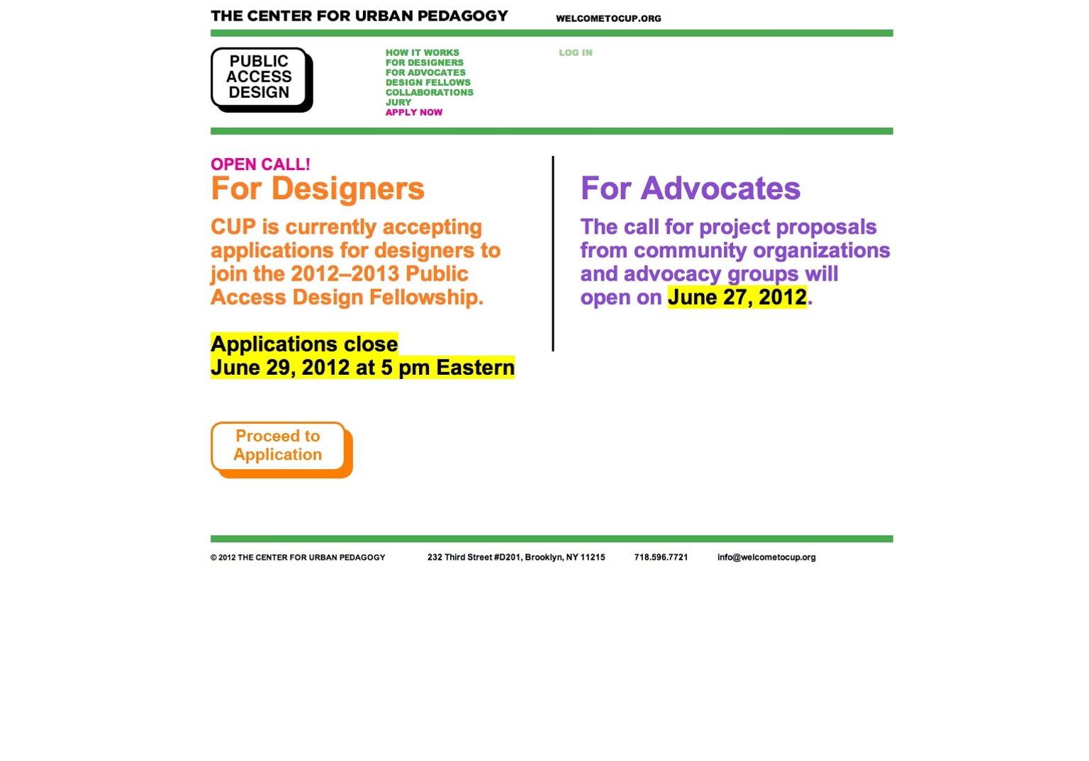 As part of our work with the New York-based Center for Urban Pedagogy (CUP), we’ve developed a website for Public Access Design, a participatory design initiative launched by CUP in June 2012. Our site enables designers and community advocates to connect and collaborate, functioning as an online environment that nurtures socially and politically engaged design work. These collaborations can result in posters, booklets, videos, and interactive graphics, each intended to inform local communities about a complex policy or planning issue.