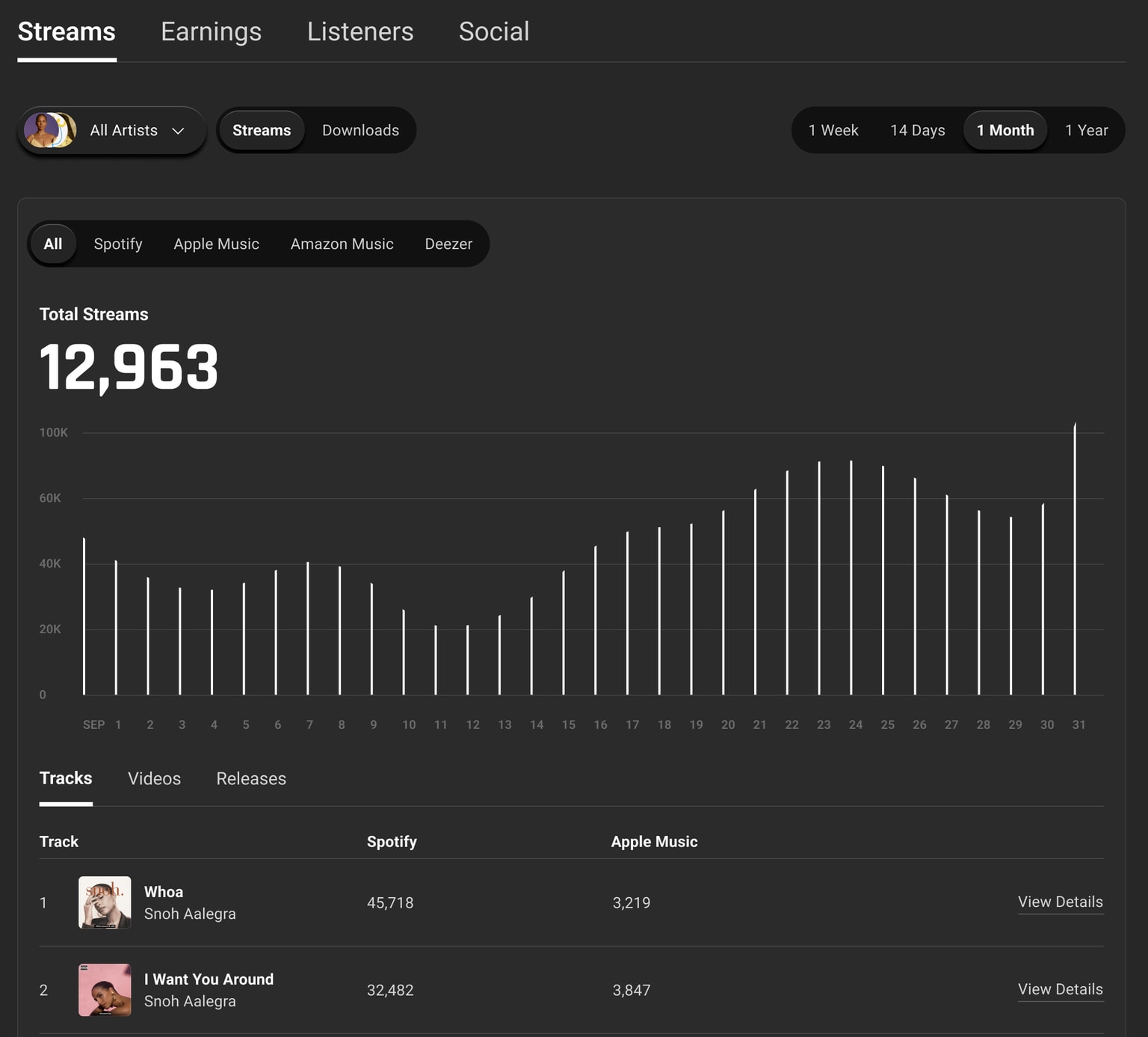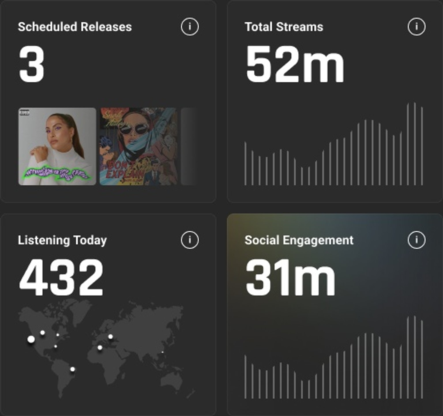Artists can understand their audience on a deeper level, with access to valuable data insights and analytics about their streaming activity AND social profiles in unmatched detail, incorporated into a single shared surface.