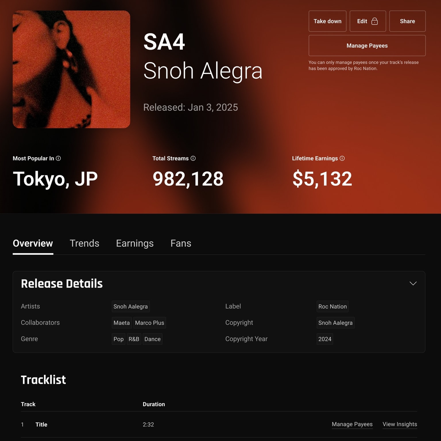 The ROC Nation distribution dashboard innovatively integrates social profile insights including Meta, X, TikTok and more, to give artists a truly holistic view of their followers, who’s talking about them, and who their followers follow, all overlaid on their listeners and their music drops....