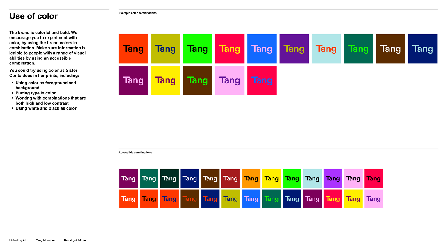 The identity uses a secondary color palette in a bold and playful way to create a sense of welcoming and experimentation. This palette draws from Sister Corita’s artwork.