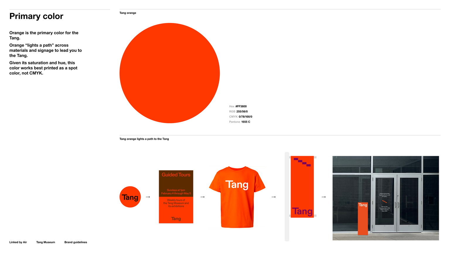 Orange is the primary color for the Tang. Orange “lights a path” across materials and signage to lead you to the Tang.