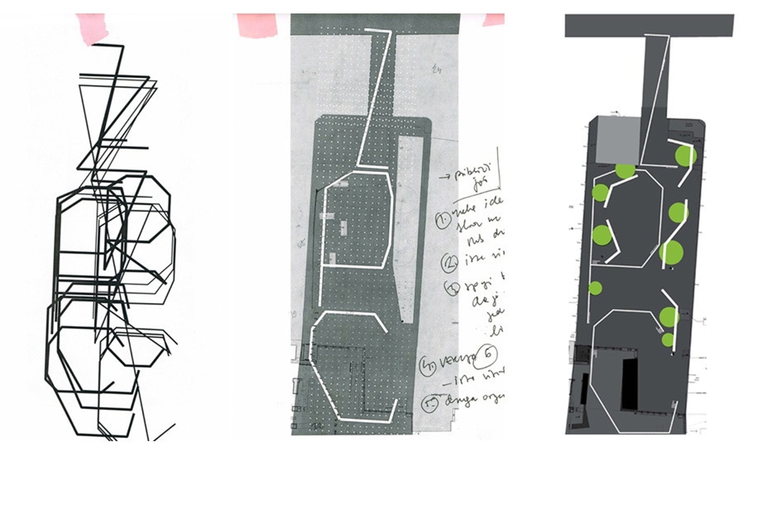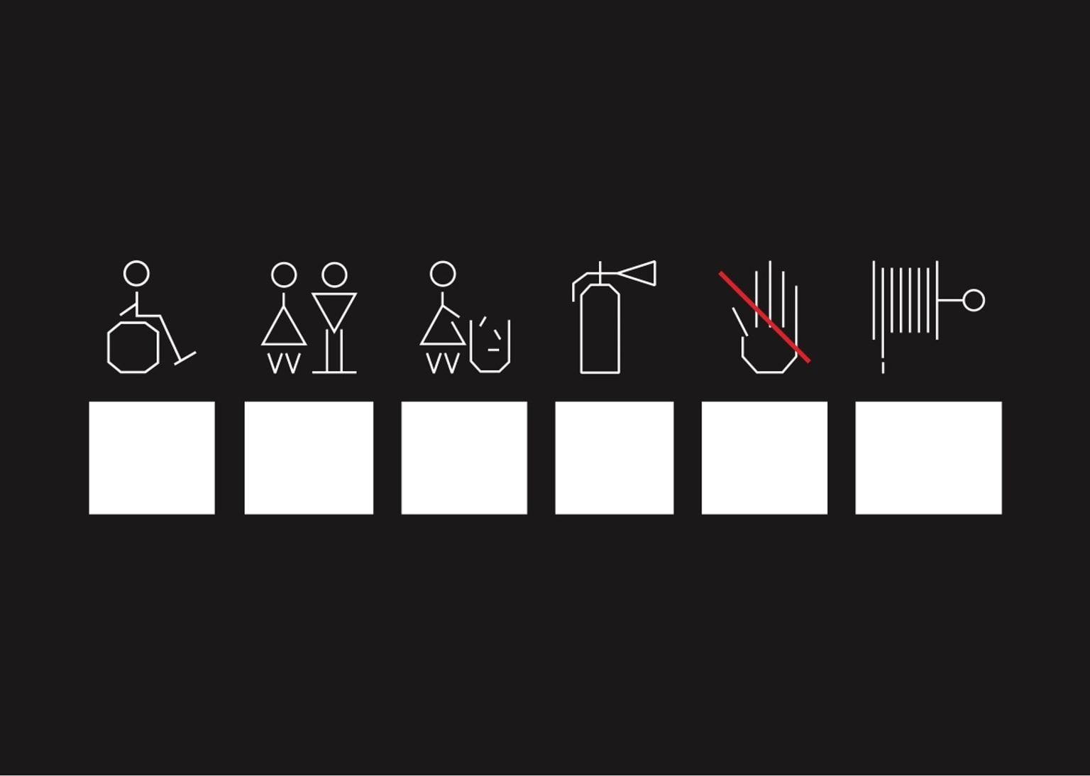 The tail of a huge Z painted on the street helps to lead visitors into an inner courtyard, where the theater is located. The Z then joins with a P in the courtyard, followed by a C that winds its way into the building. Once inside, underlines on informational signs create a giant rhythm through the building in the form of an irregularly dashed line. We thought dance is about discontinuity as much as continuity.