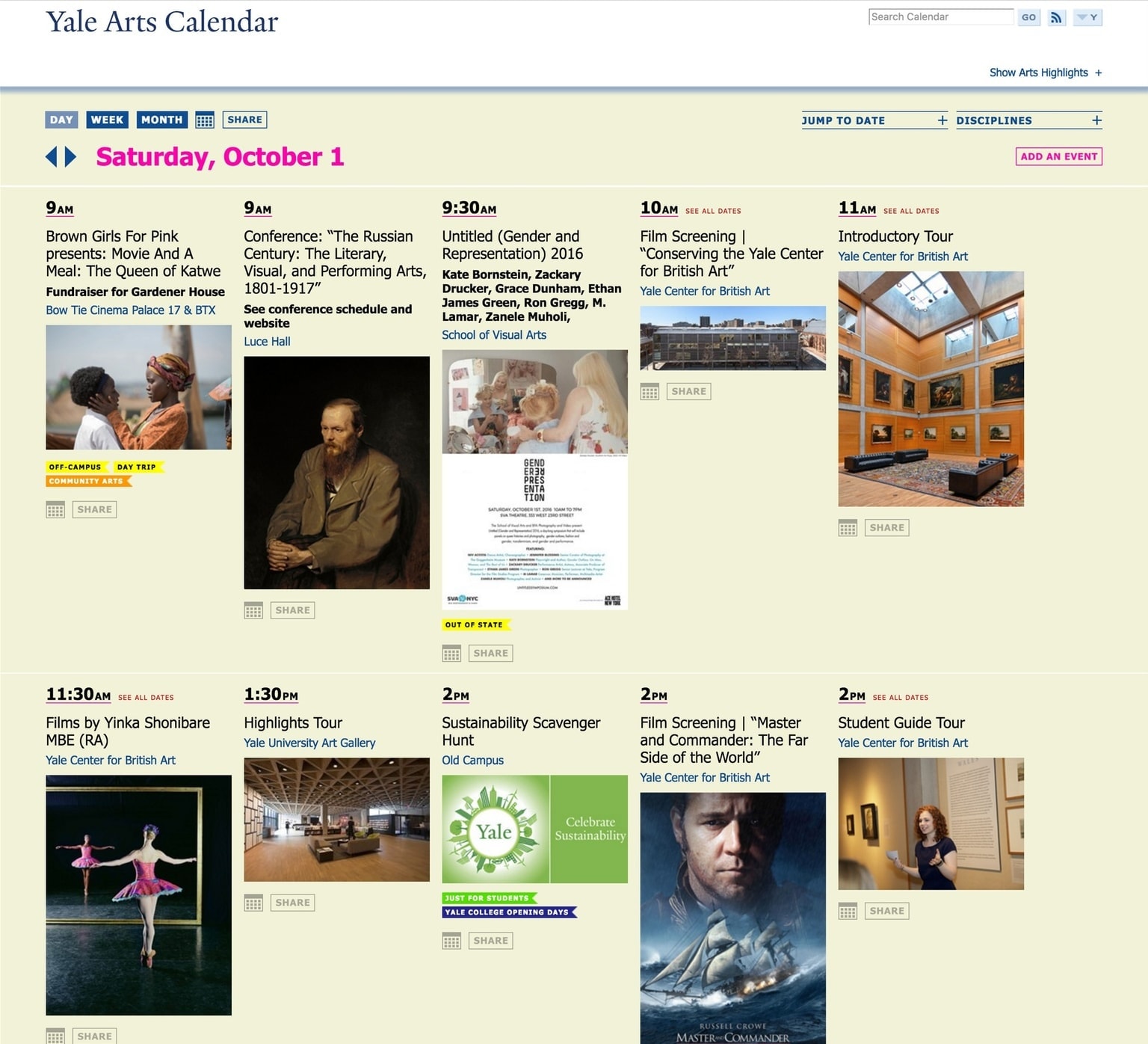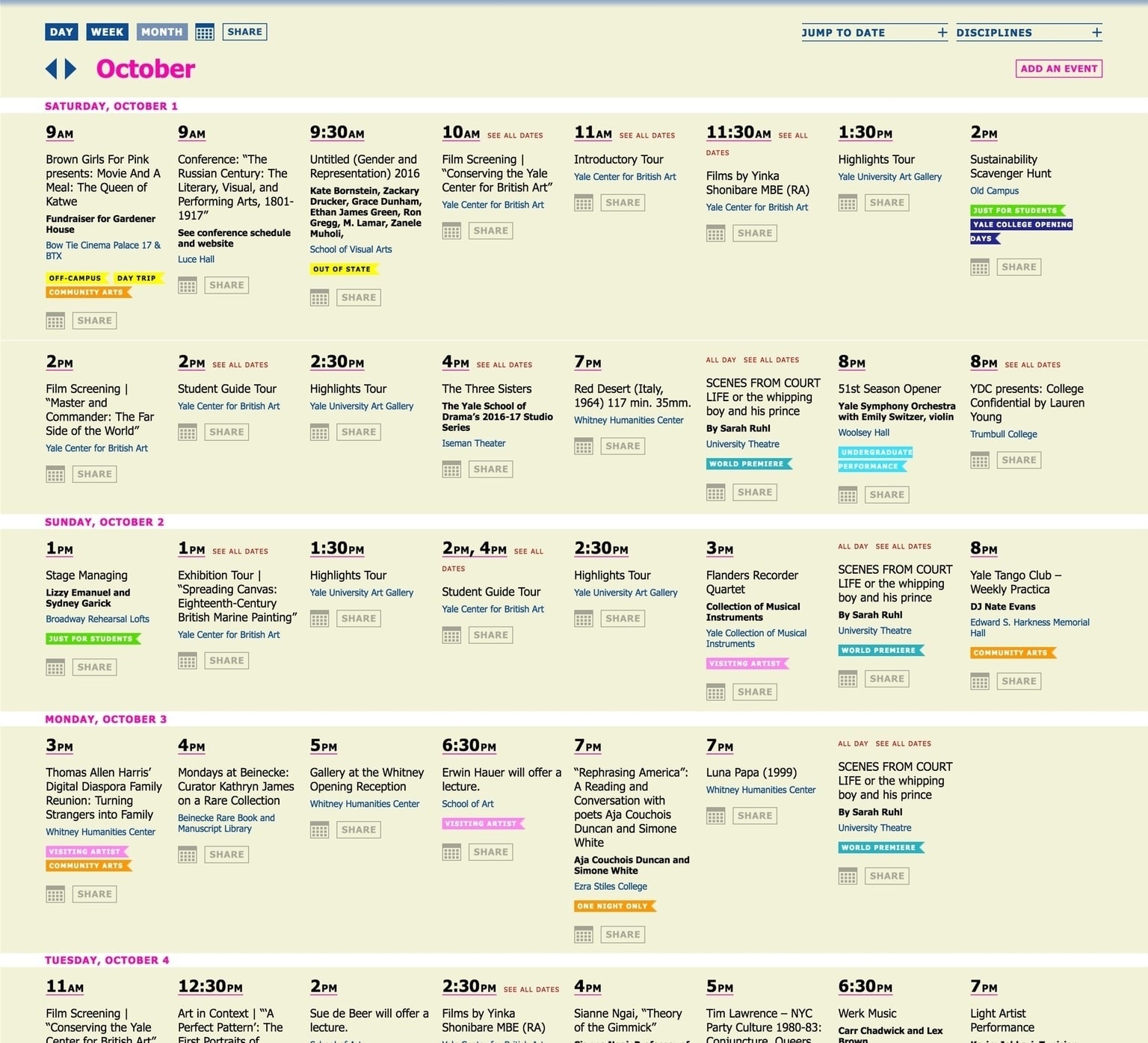 We’ve launched an online arts calendar for Yale. For the first time, this calendar brings arts events and performances from many institutions and departments across this large university, together onto one surface. Members of the public can find something that interests them, and students at the undergraduate and graduate level can use the calendar as a tool to stimulate collaboration across disciplines and to find inspiration.