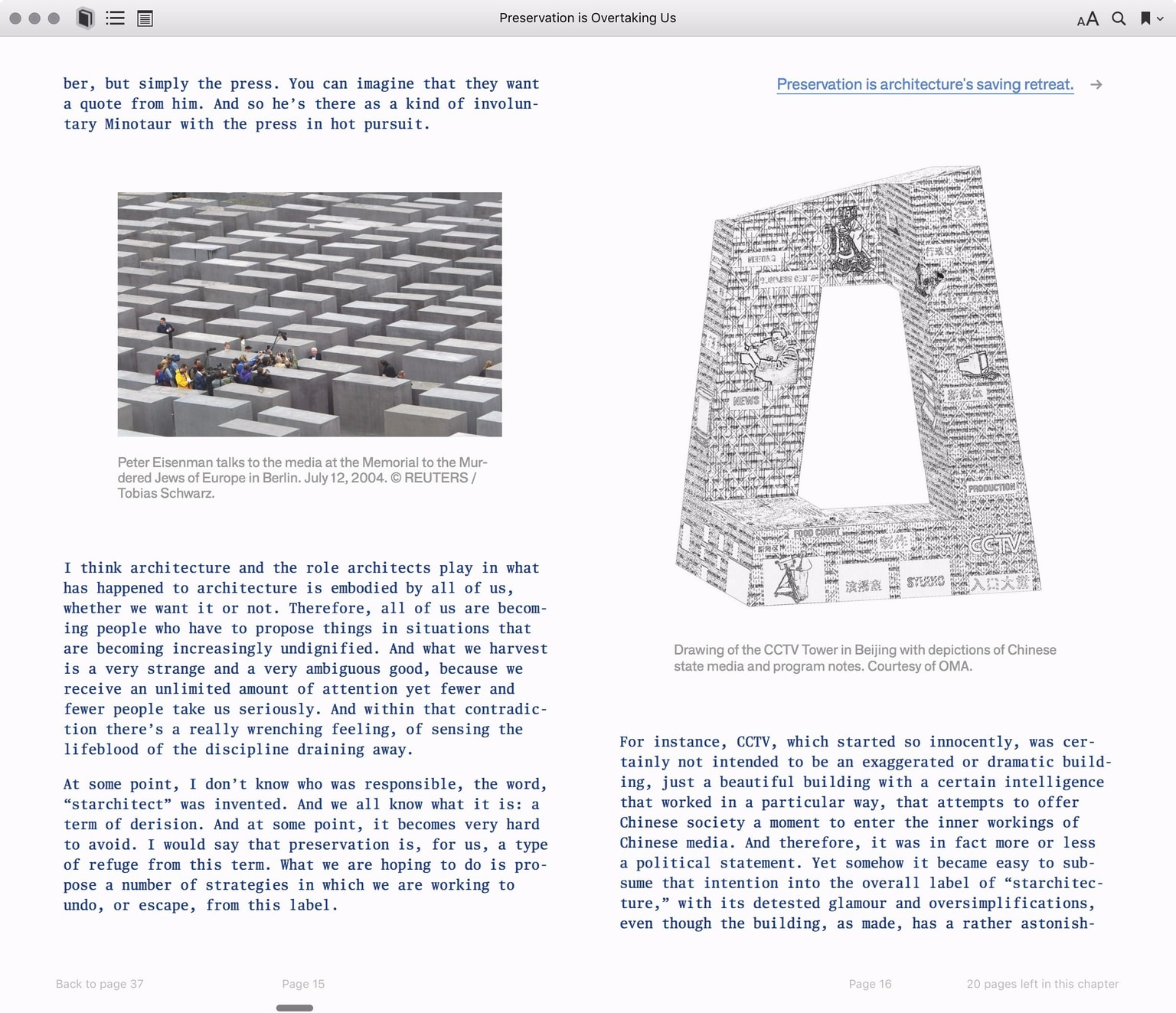 Reader, Columbia Books on Architecture and the City’s new digital publishing platform, explores the virtualization of book content, wholly synthetic and not beholden to the physical constraints of ink on paper. Publications (some also available in print, some not) can be read on the web and downloaded as ePubs, as well as purchased as printed matter where available.