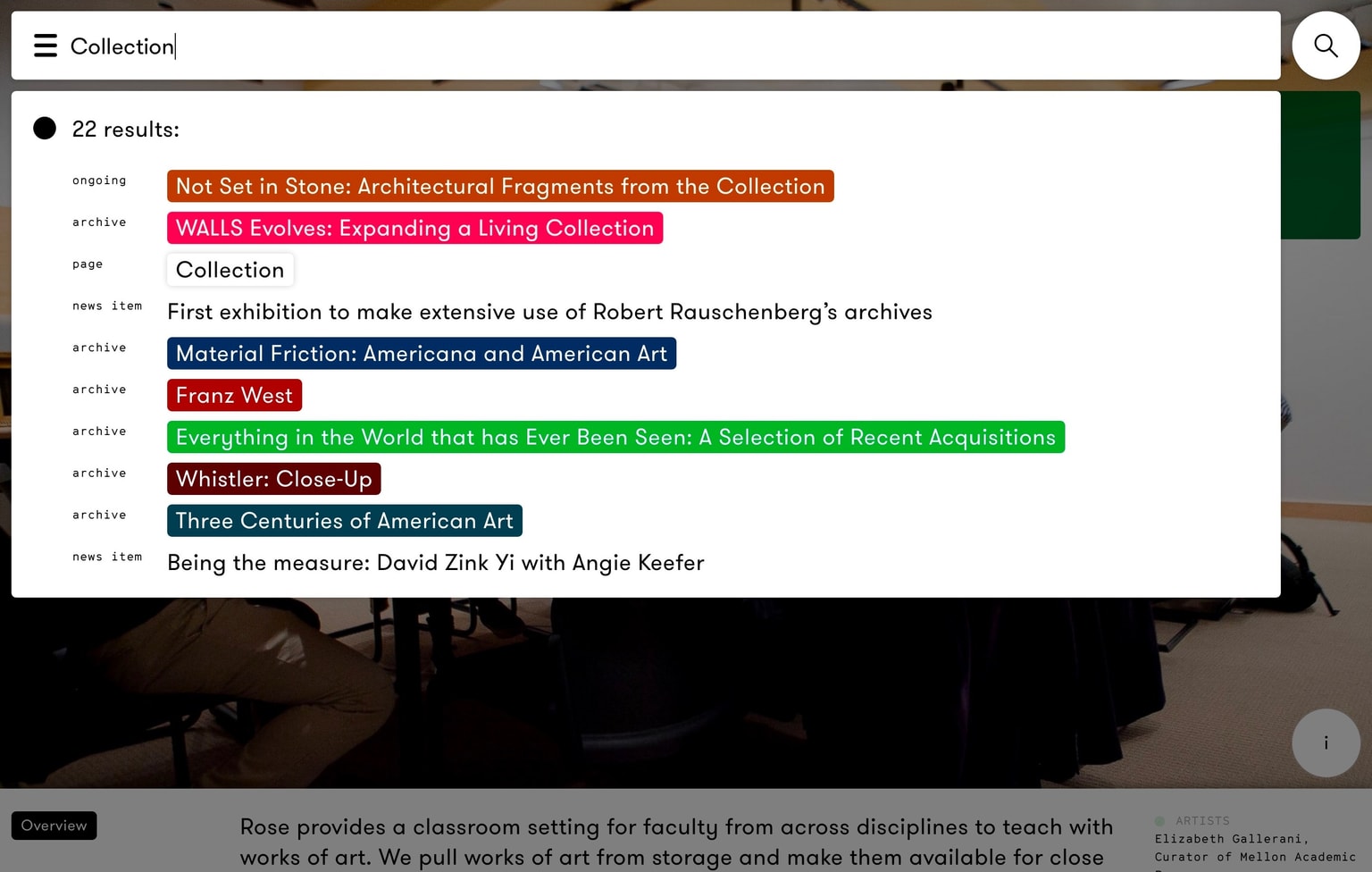 When we first visited WCMA we observed a unique use of space within the museum that, to us, spatially demonstrated the museum’s unique approaches to curation, teaching and publics. Where one gallery was set up as a classroom lab, others resembled salon-style reading rooms, artist project spaces or even collection store-rooms. In our design for the website we wanted to convey a tangible sense of crossing the thresholds of these spaces and give users the ability to orient themselves to virtual spaces, artworks, events and even other visitors.