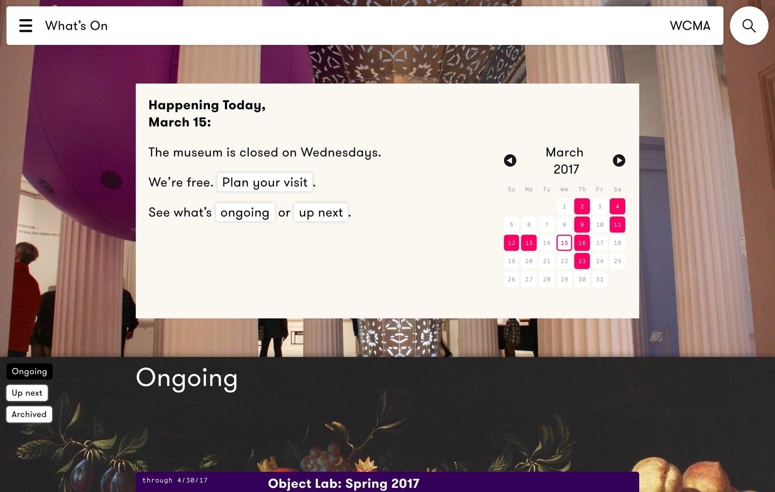 Perhaps most radically, our design eschews almost all categorization – simply identifying content as “ongoing” or “archived”. As such, the site gives WCMA a platform that leaves creative space for future exhibitions and programs which may not fit the mold established by a content management system set up to with distinct silos.