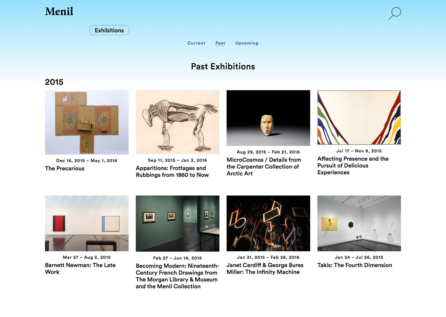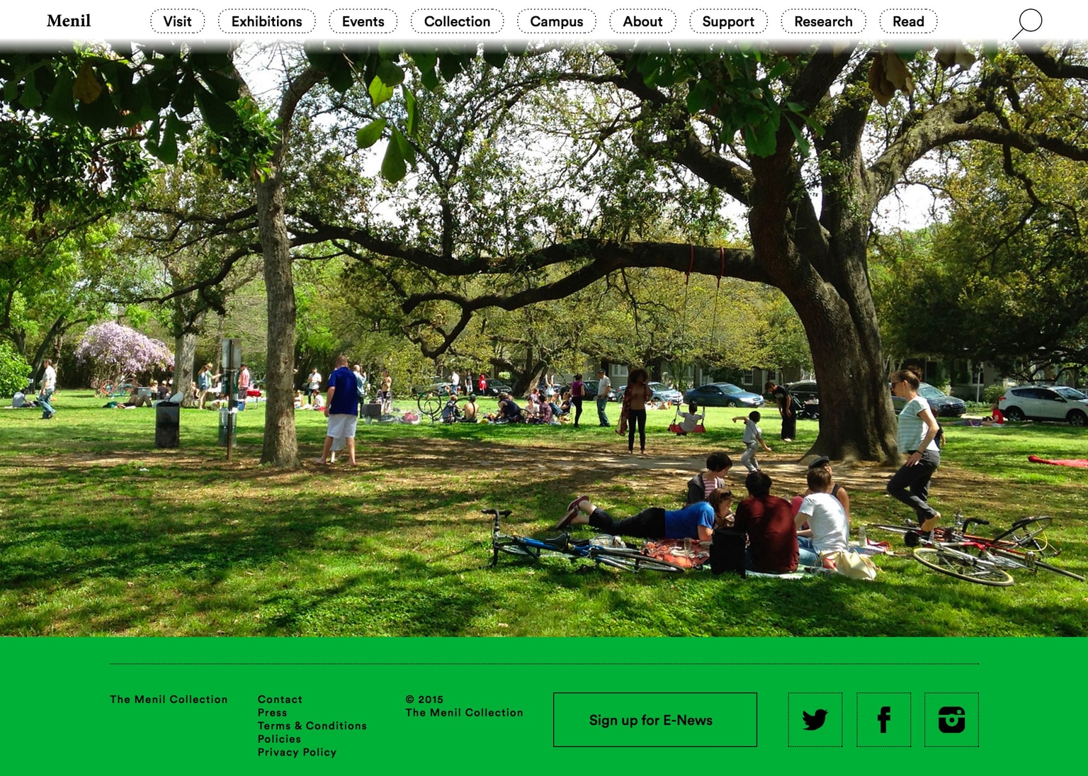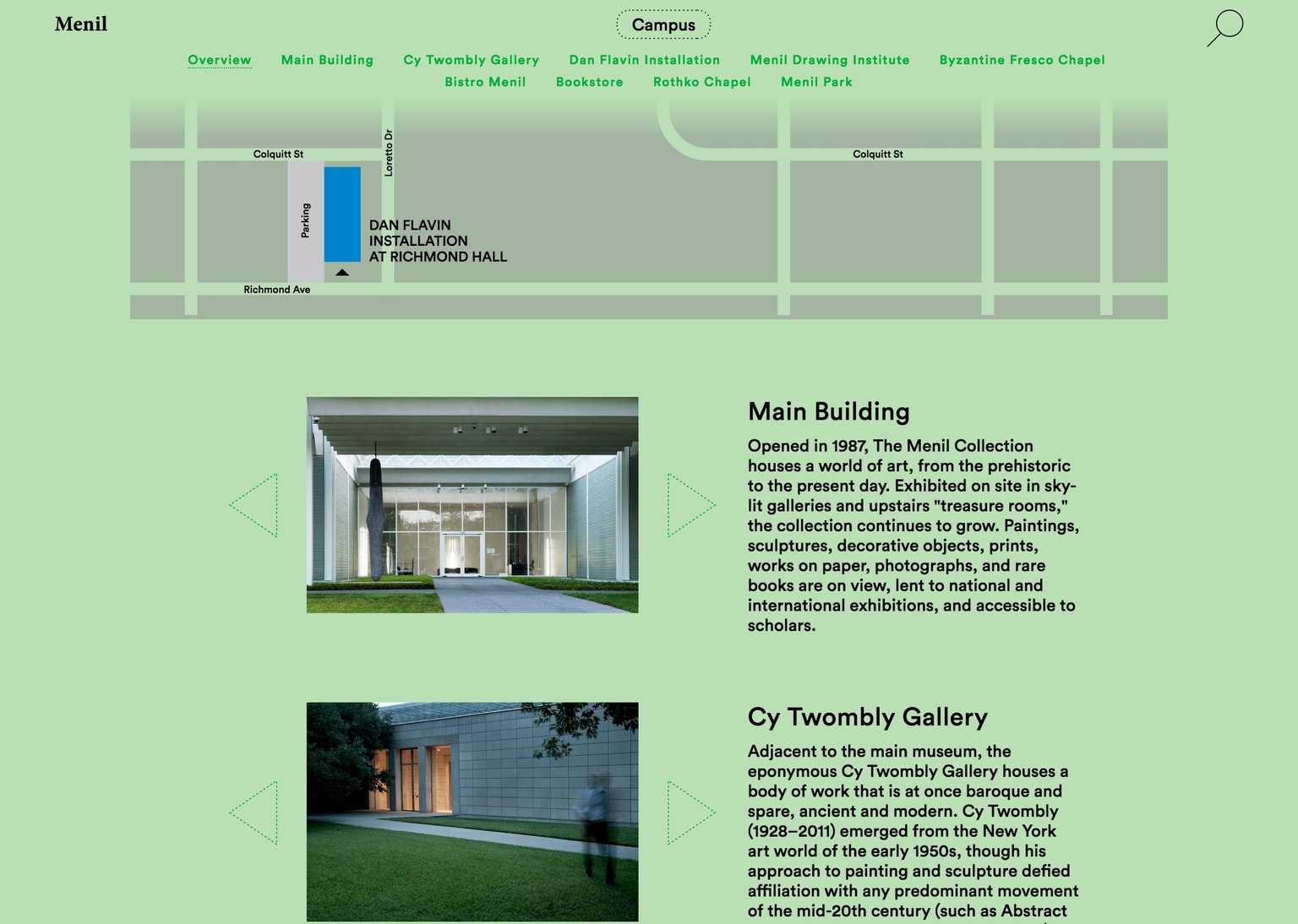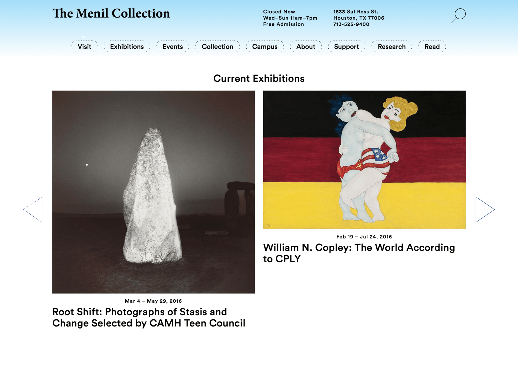The Menil Collection website emphasizes the museum’s special campus. The museum’s progressive legacy in the civil rights movement, its strong collection of surrealist art, and its unique historical approach to exhibition design, inspired a colorful and theatrical approach to the web design and user experience, even as the design remains sober and minimalist in its design.