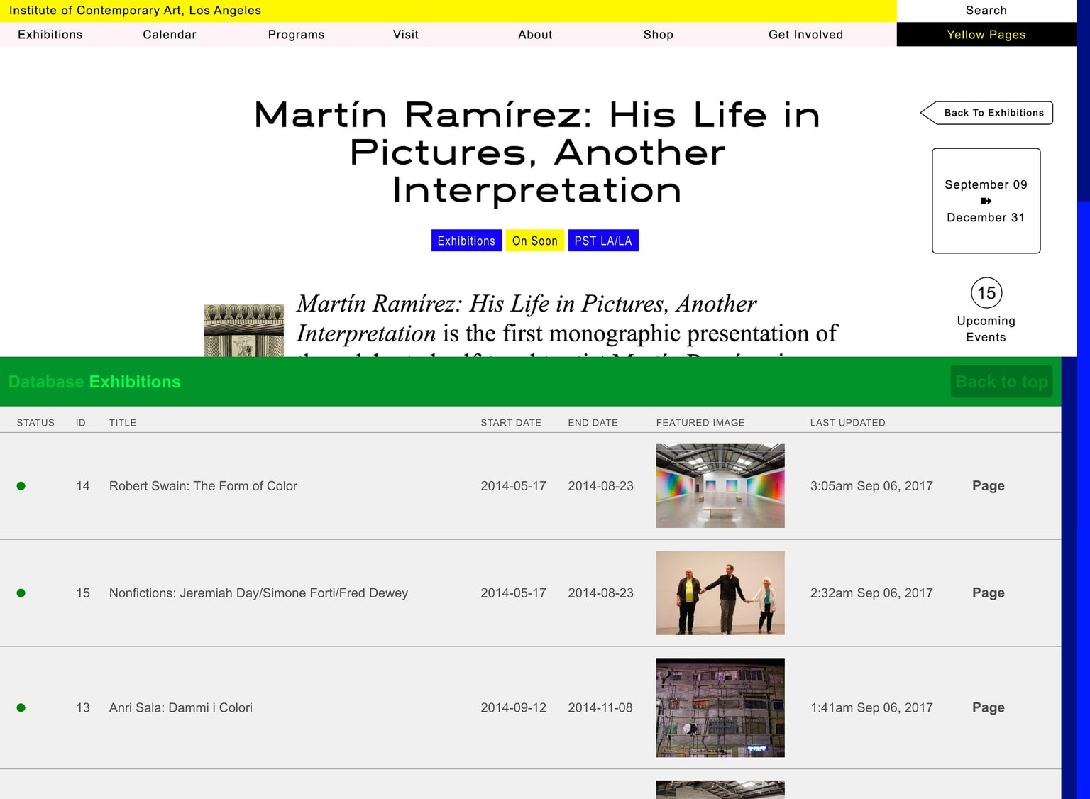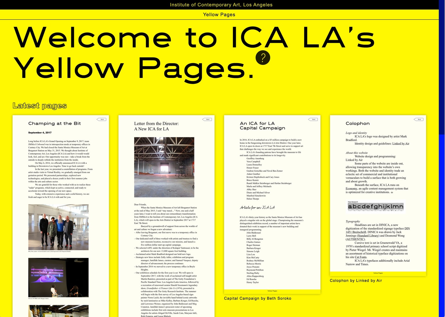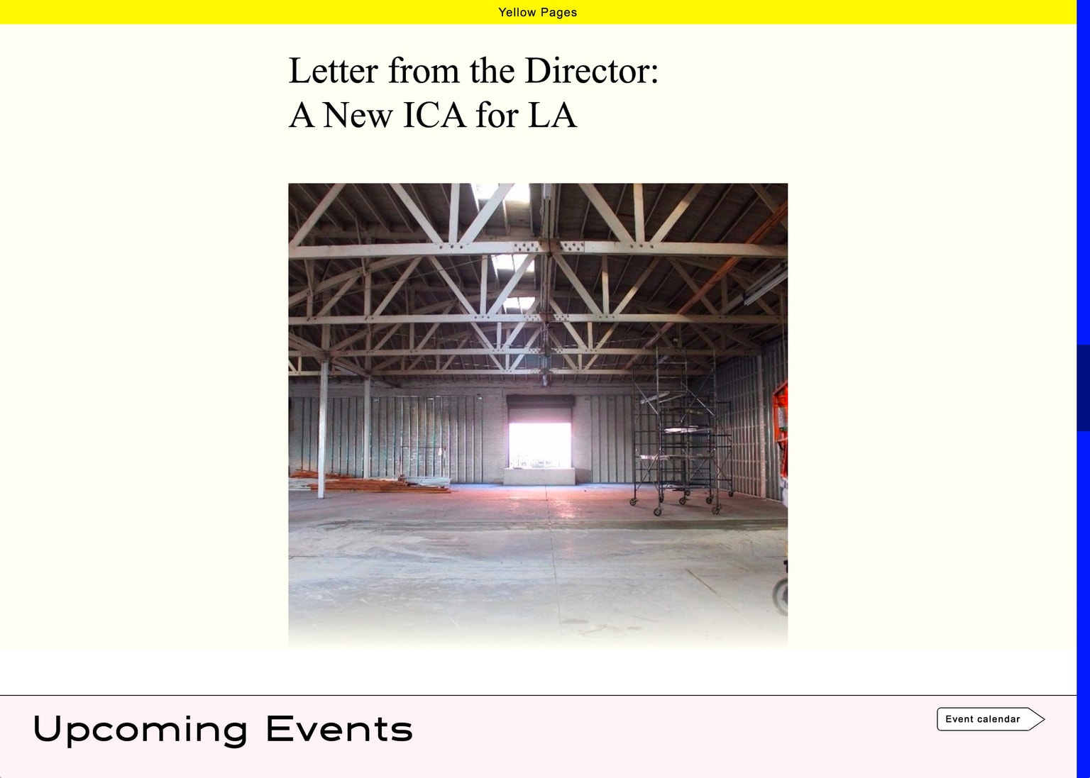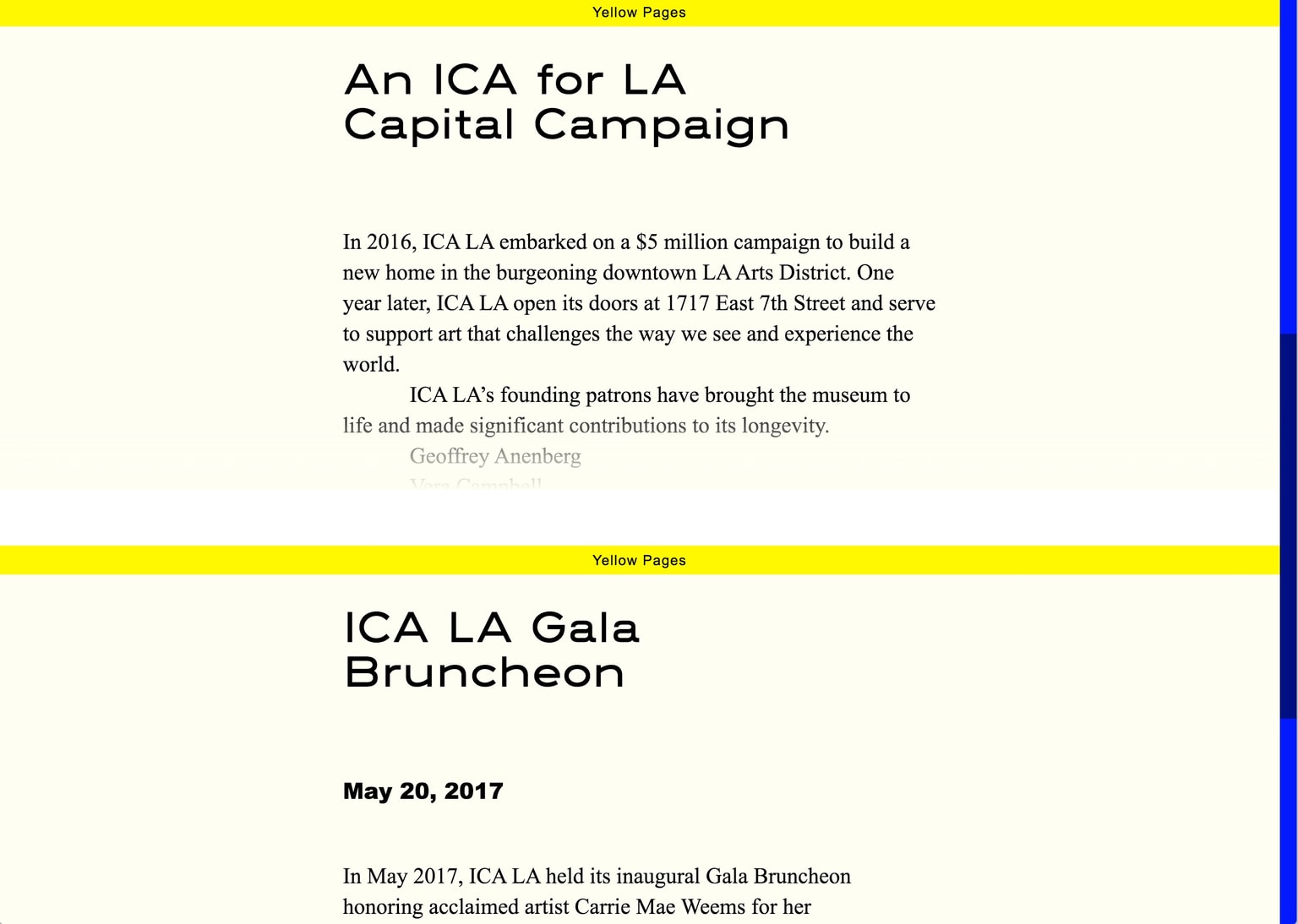 Mirroring the physical space, we designed a website with a visible and accessible database, the website’s inner workings made transparent for all to see. Following the Mark Bradford-designed logo for the new institute, both in terms of color and the locally-posted Colby posters that were a part of its inspiration, we designed a “yellow pages” section for the website that allows the decentralization of content creation and offers opportunities to invite guest artists, curators, or members of the local community to develop new pages for the website. This embodies ICA LA’s community-facing project and becomes a part of the site that can grow with its community and facilitate broad creation.