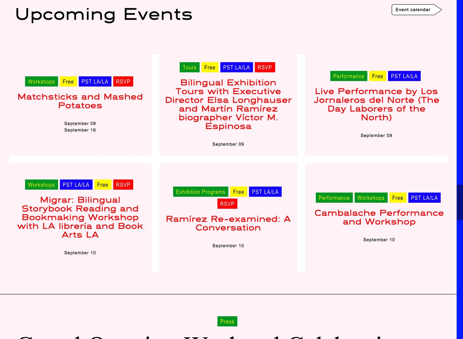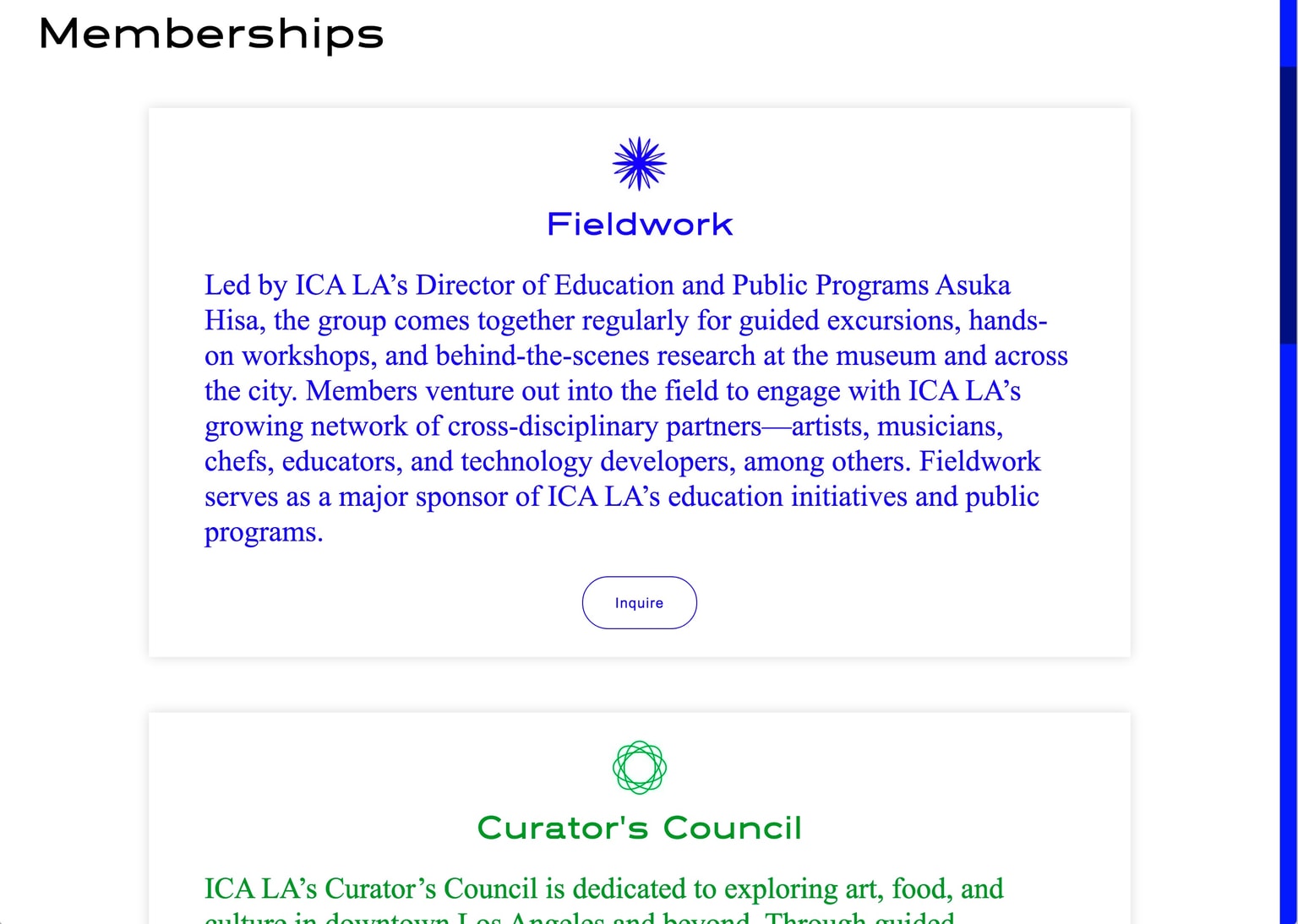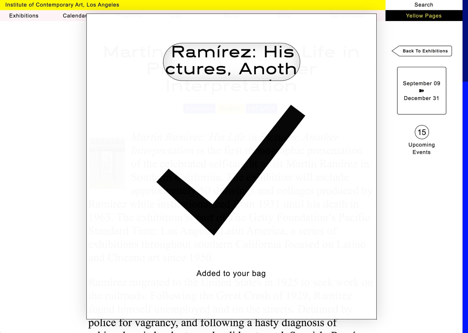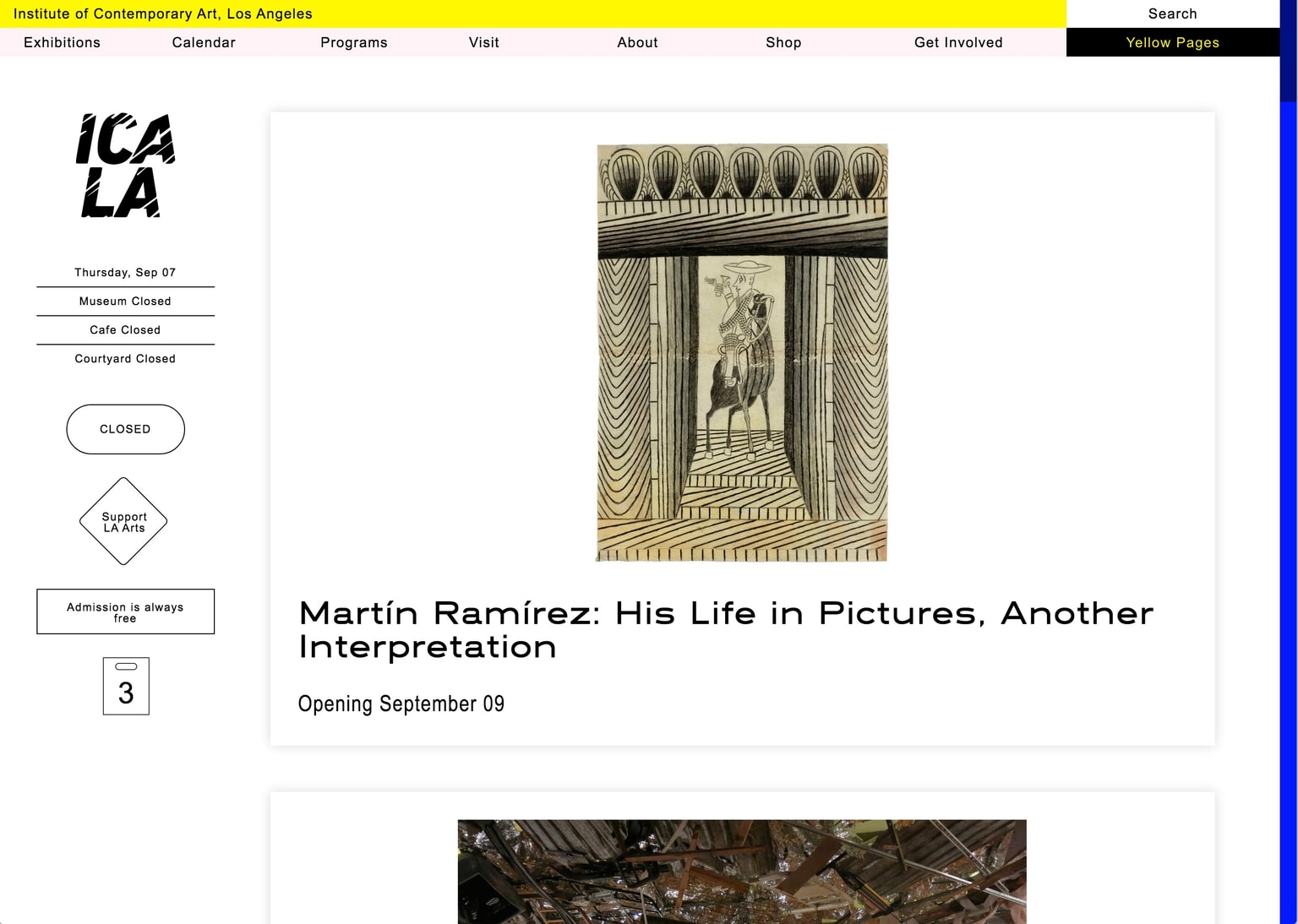 Mirroring the physical space, we designed a website with a visible and accessible database, the website’s inner workings made transparent for all to see. Following the Mark Bradford-designed logo for the new institute, both in terms of color and the locally-posted Colby posters that were a part of its inspiration, we designed a “yellow pages” section for the website that allows the decentralization of content creation and offers opportunities to invite guest artists, curators, or members of the local community to develop new pages for the website. This embodies ICA LA’s community-facing project and becomes a part of the site that can grow with its community and facilitate broad creation.