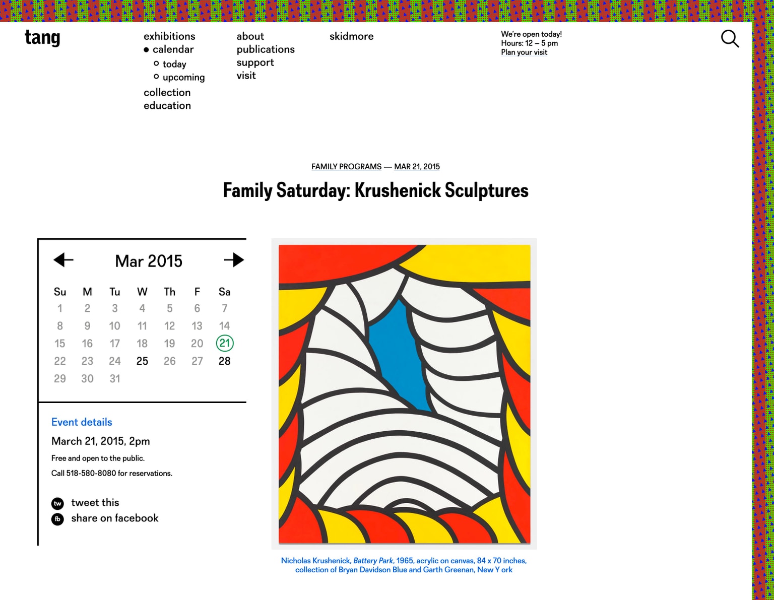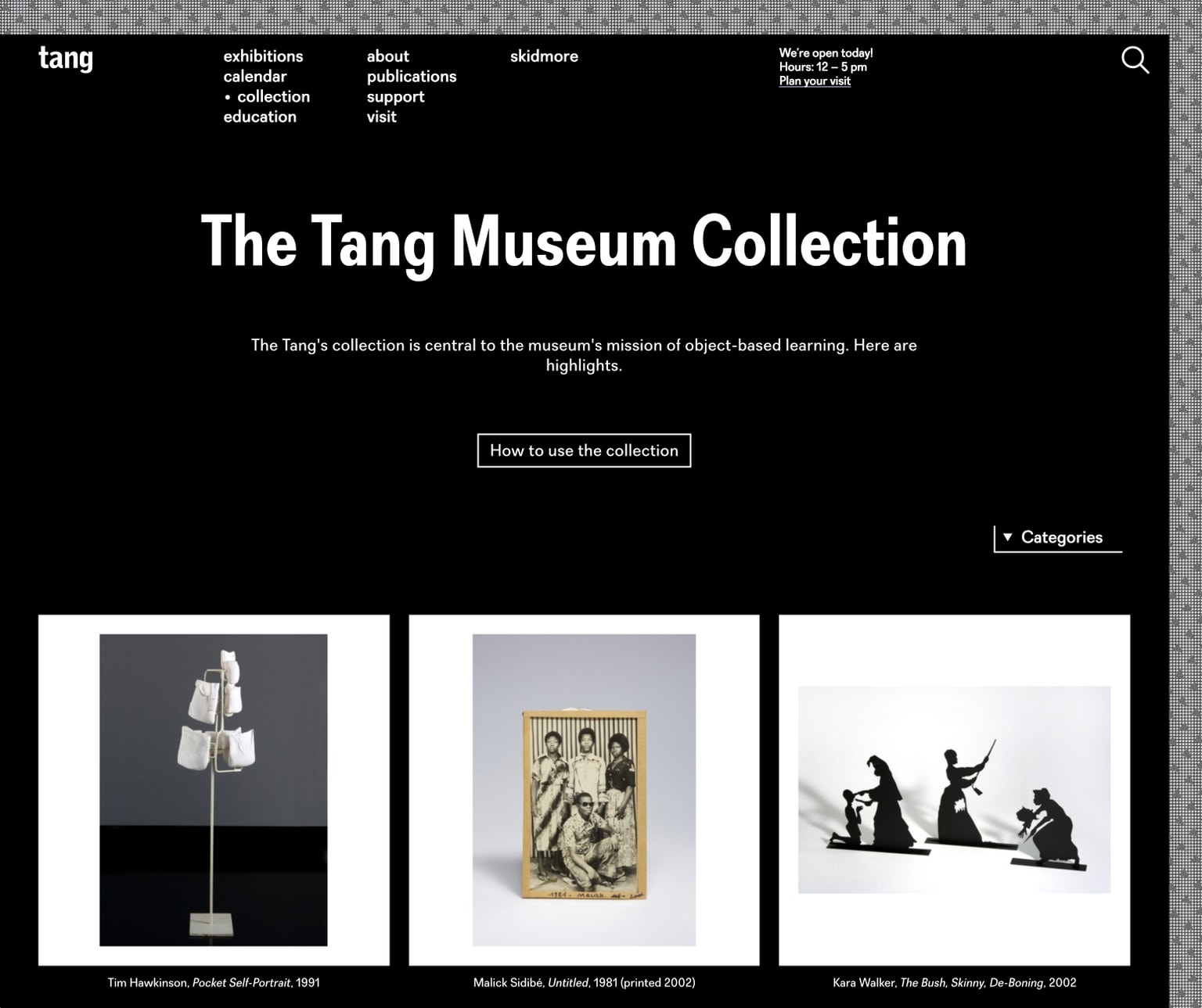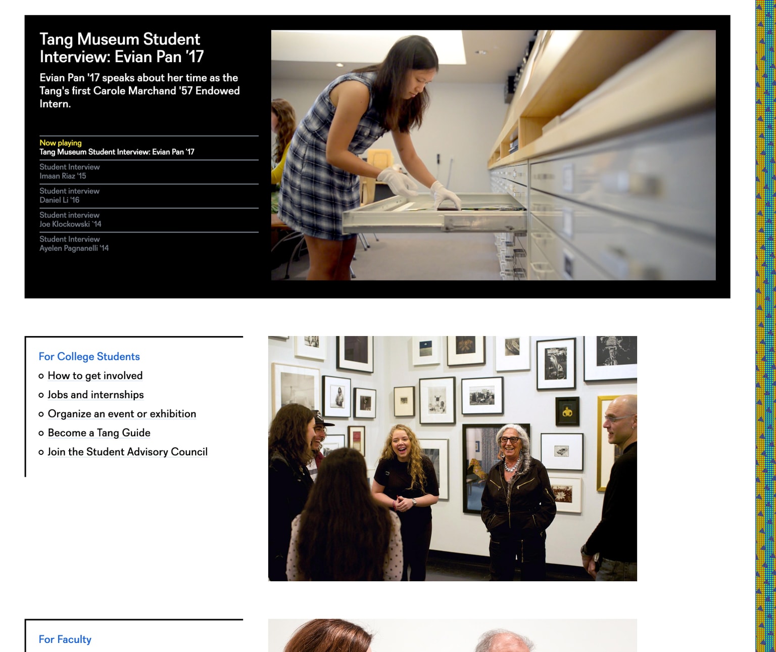 As a teaching museum, the Tang makes great use of our flexible content management system, Economy. The website constantly expands to accommodate diverse narratives about exhibitions, public programs, and the many ways the Tang works with faculty and students to support liberal arts, museum practice, and cultural production.