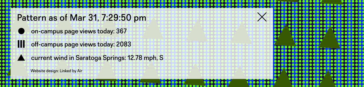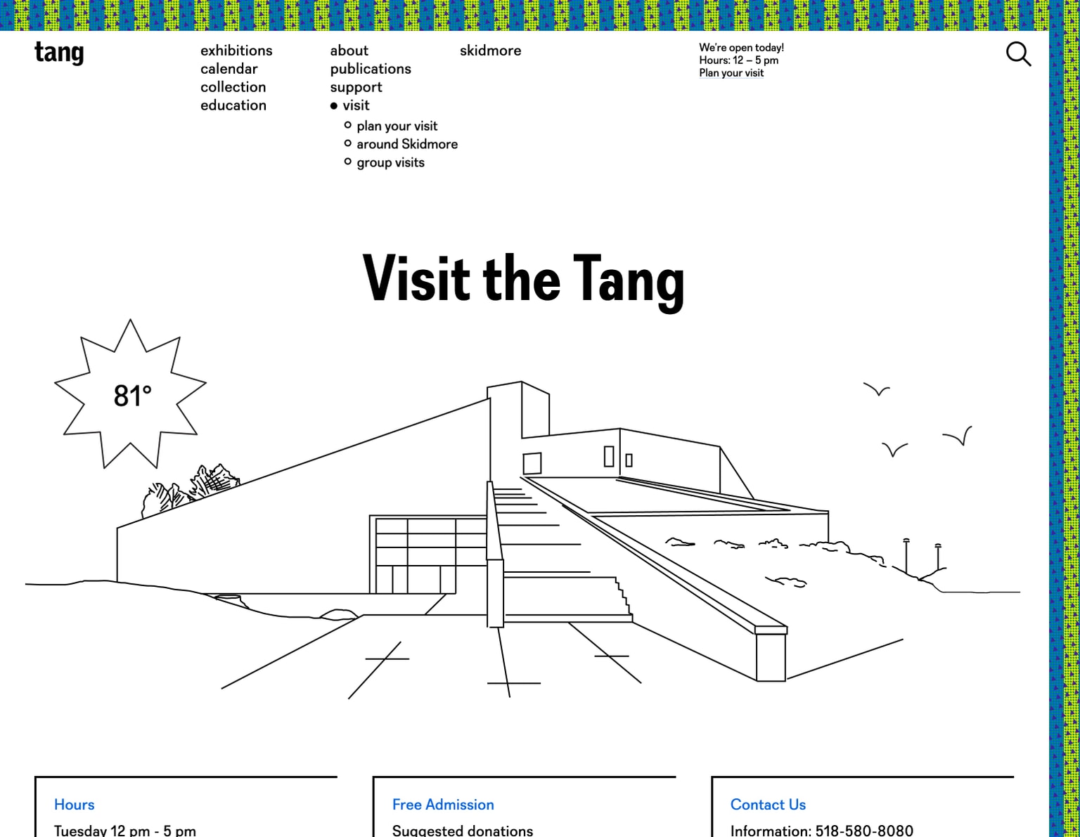 The website for the Tang Museum, the contemporary art museum at Skidmore College, features a dynamic background. The layers of its pattern change from minute to minute, and represent the current number of website visitors from on Skidmore’s campus, and from off campus; and the wind speed and direction outside the museum. The patterned border recurs in printed materials we developed for the Tang.