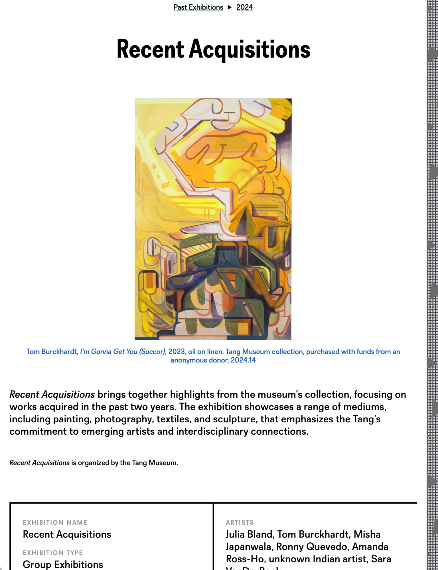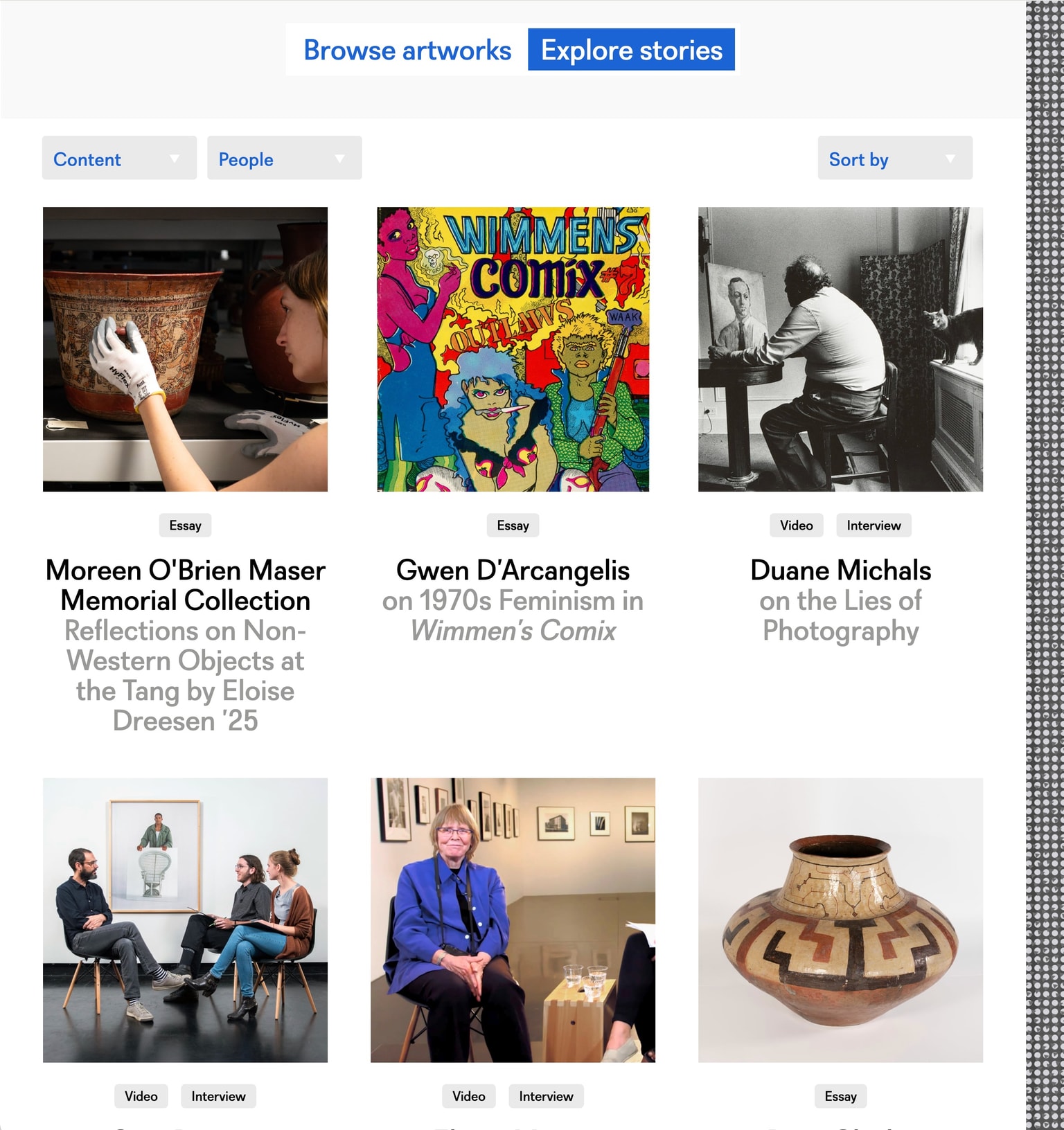 Even as the project covers the breadth of the Tang’s permanent collection, and for the first time integrates the website with the Tang’s Embark collection management software, the project is also a component of the museum’s ambitious cross-disciplinary initiative, Accelerate: Access and Inclusion at the Tang Teaching Museum. Visitors can explore stories about the artworks through new scholarship by faculty, staff, students, and guests; creative responses to the collection through music, dance, and new visual art; and video interviews with artists.