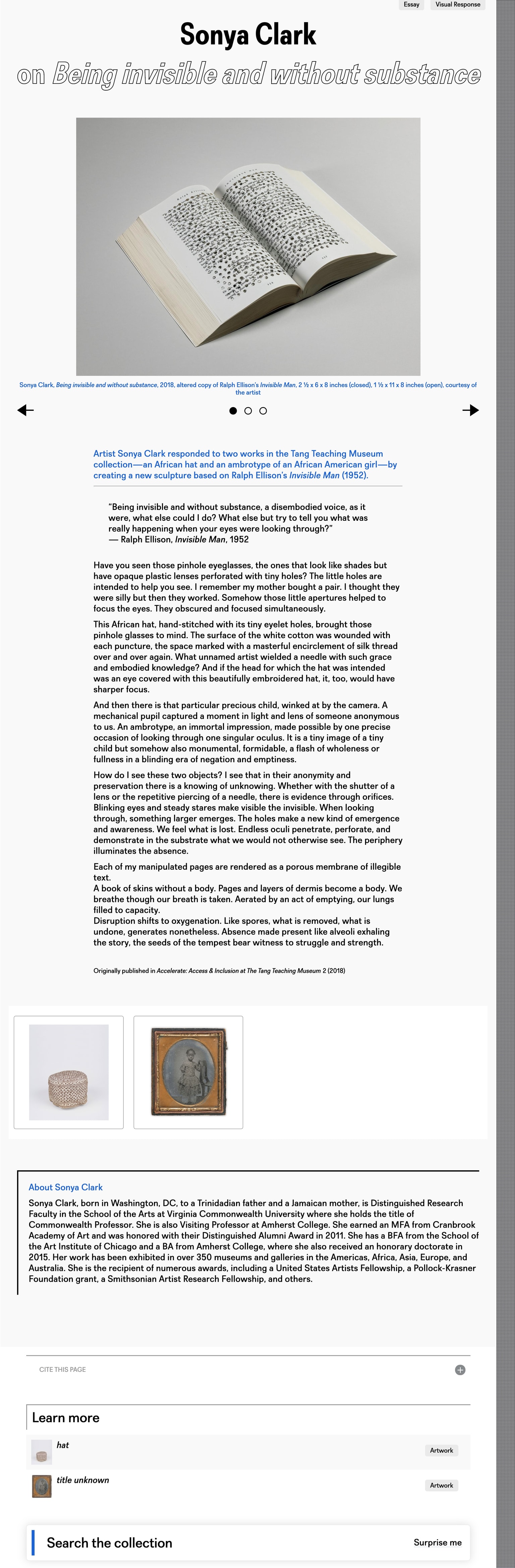 These stories draw on the Tang’s deep permanent collection, leading to a truly rich way to explore art and narrative online. They are often also linked to exhibitions and public programming from the initiative, and writing for the Accelerate annual printed magazine which we also designed. A highly integrated and coherent combination of technical work, design in multiple media, public programming, community inclusion, and scholarship leads to a social and cultural project that is greater than the sum of its parts.